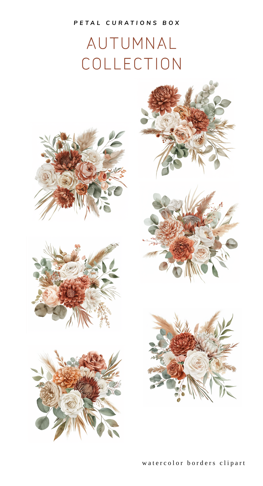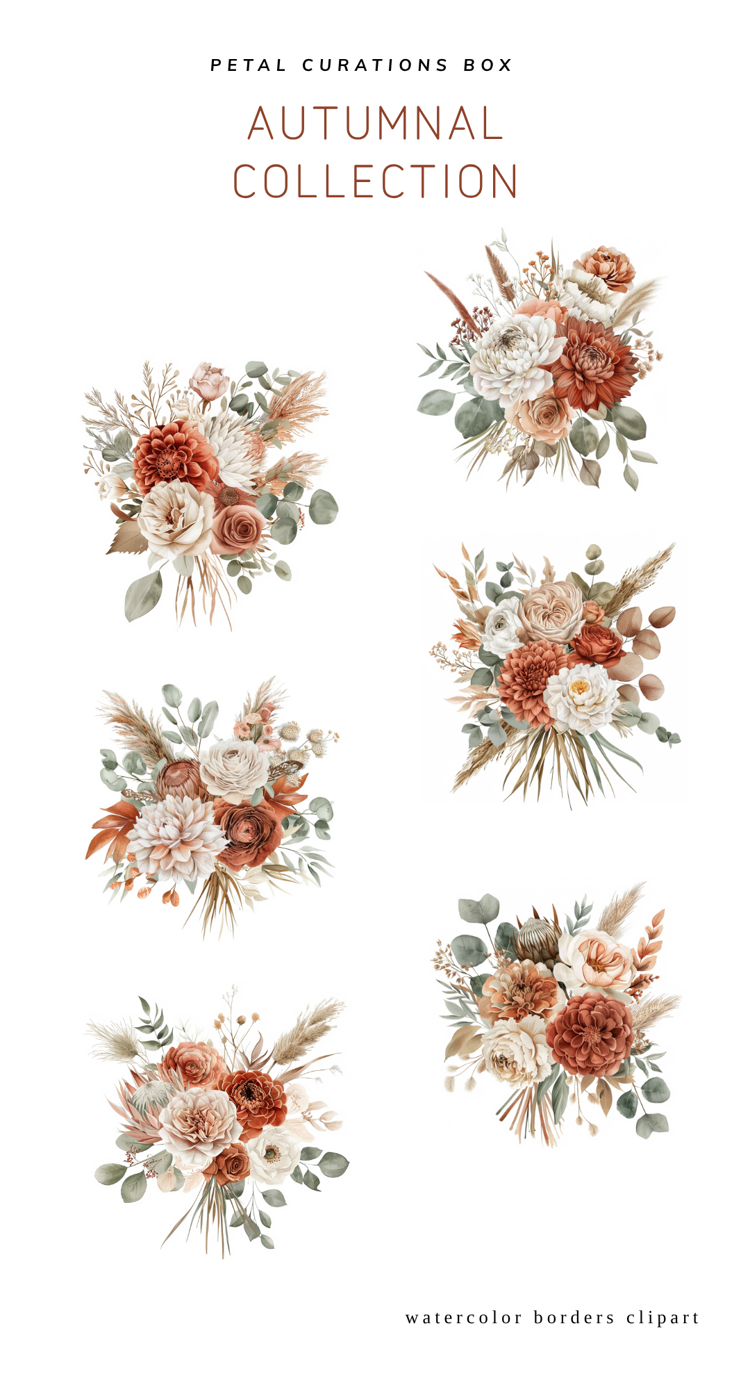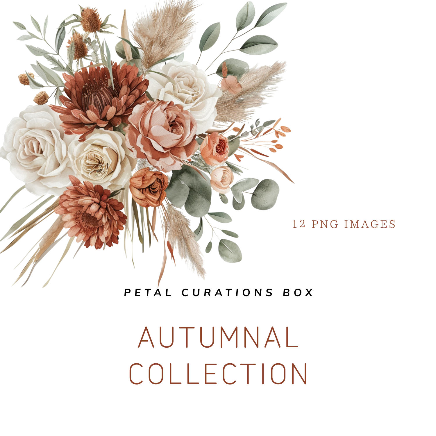 繊細な水彩タッチで描いた「 AUTUMNAL COLLECTION」グレイッシュカラーも含んだ、少しラステックな色合いで、あらかじめ作成されたフラワーアレンジメントで制作された素材です。